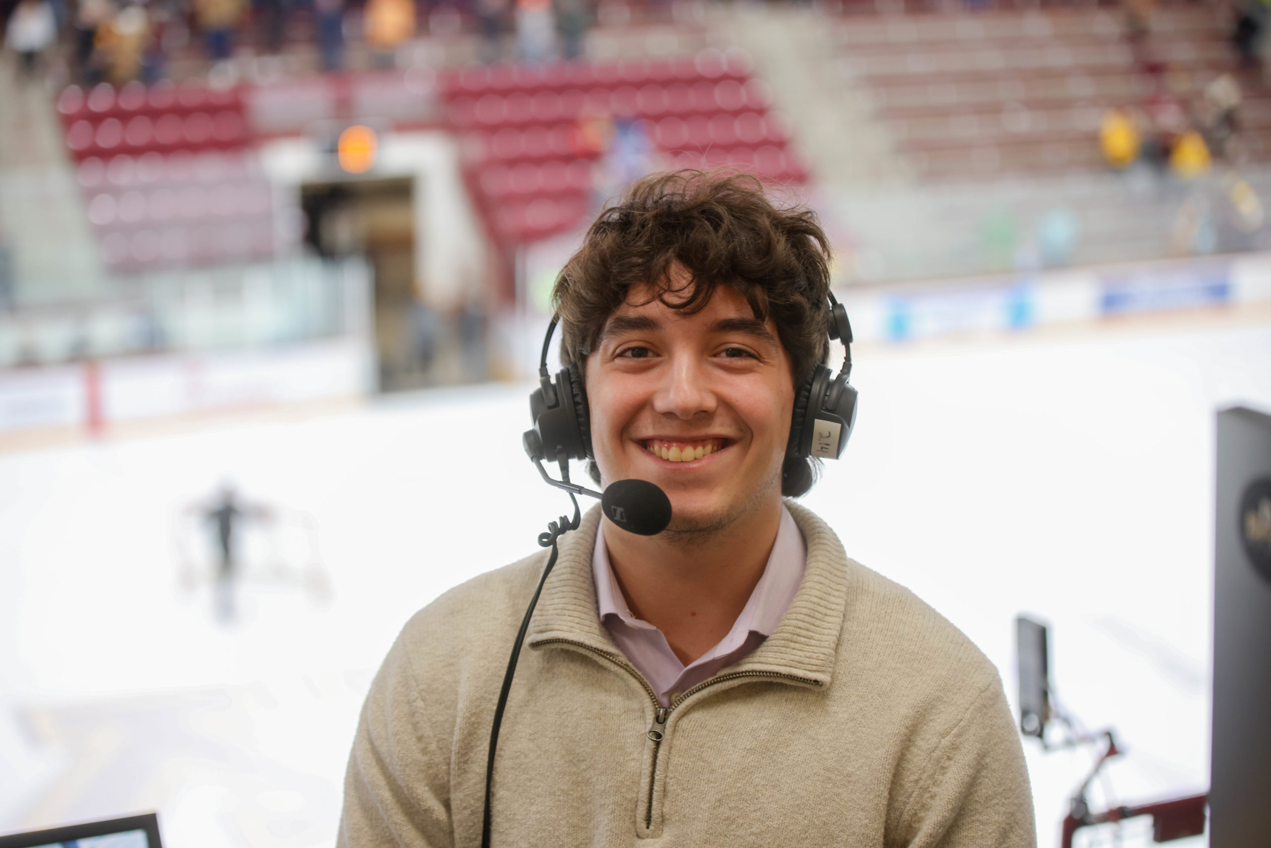 Big Ten Plus Announcer Eitan Schoenberg poses for a portrait after broadcasting during the Minnesota – Twin Cities vs. Minnesota-Duluth women’s hockey game, Friday, Feb. 23, 2024. “I love announcing games,” Schoenberg said. “I hope I can make a career out of this one day, but for now, it’s just a good time.” (Ethan Fine/fine0081@umn.edu)