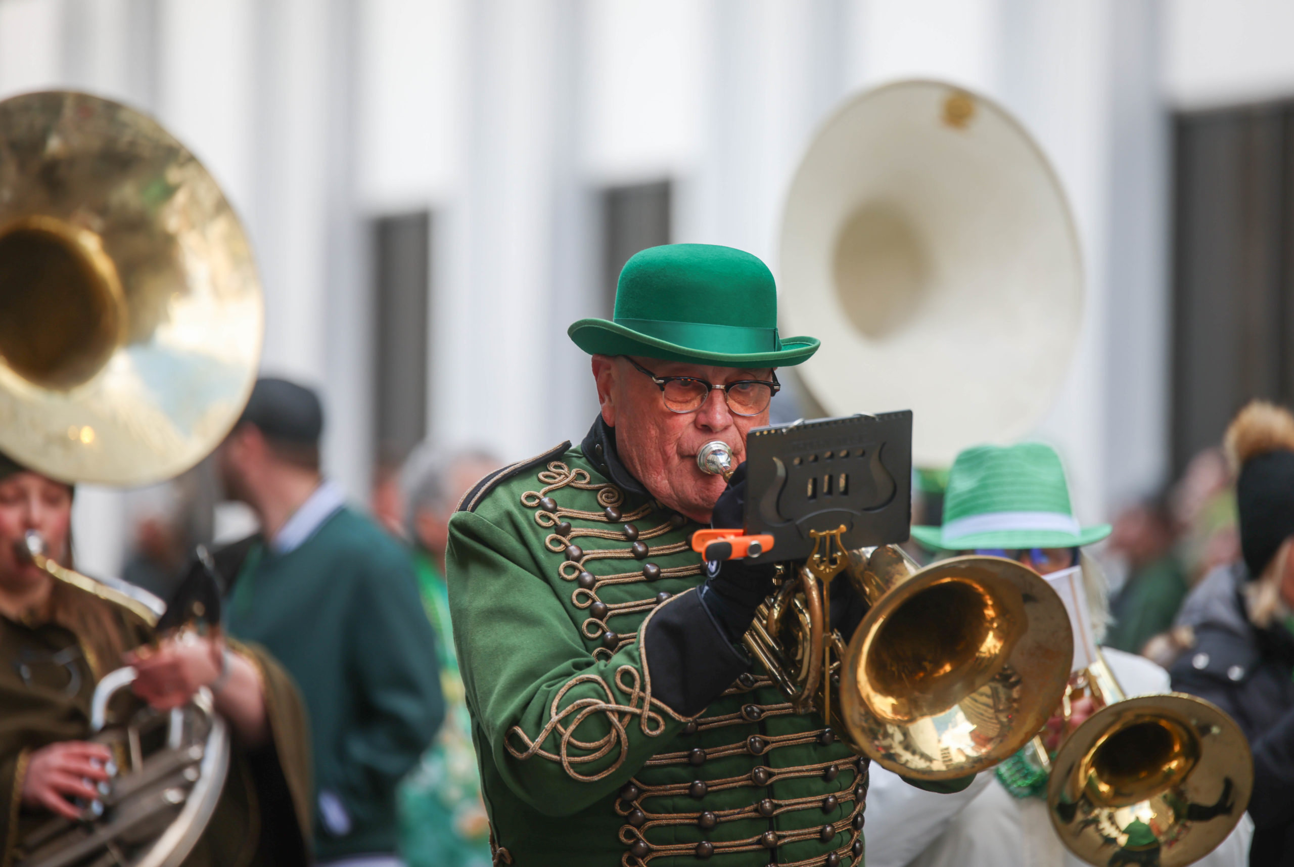 A trumpeter plays in the St. Paul Patrick’s Day Parade, Saturday, March 16, 2024. The parade began at Rice Park and ended at Mears Park. (Ethan Fine/fine0081@umn.edu)