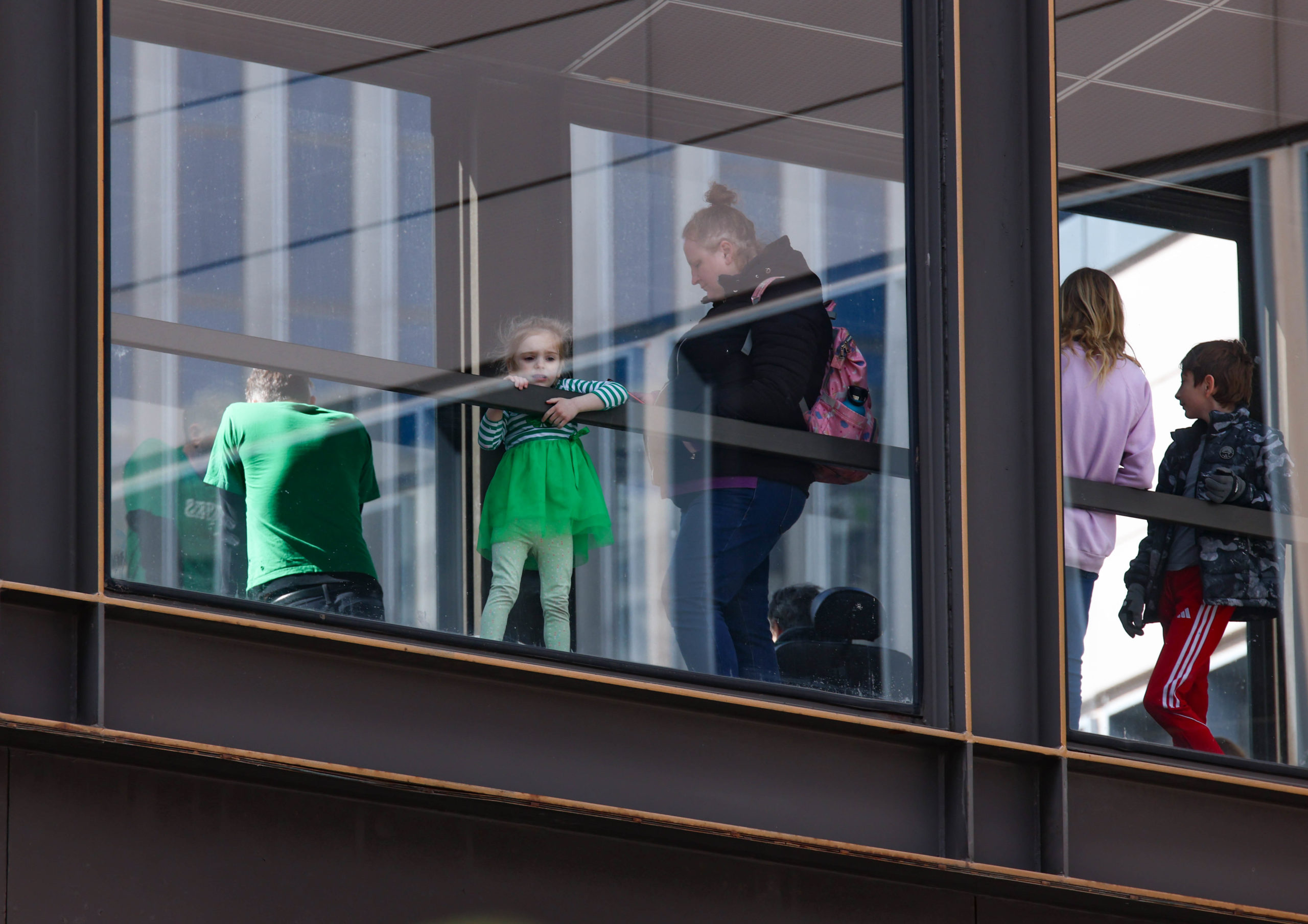 A family watches the St. Paul Patrick’s Day Parade from a skyway over 5th Street East , Saturday, March 16, 2024. Spectators opted to watch the parade from inside as temperatures dipped to the low 40s. (Ethan Fine/fine0081@umn.edu)