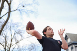 Tossing a football to his friend, Noah Friedman, 19, takes a break between his classes, Monday, Feb. 26, 2024. “Throwing the pigskin is my favorite way to relax,” Friedman said. “Throw on some music, play around and forget about everything else.” (Ethan Fine/fine0081@umn.edu)